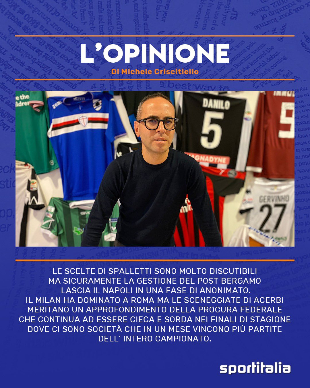 Le risate di Acerbi dopo il gol subito dalla Lazio nei minuti di recupero contro il Milan hanno fatto e stanno facendo molto discutere, ne ha parlato anche il direttore di Sportitalia, Michele Criscitiello, che scrive: “Il Milan ha dominato a Roma ma le sceneggiate di Acerbi meritano un approfondimento della Procura Federale che continua ad essere cieca e sorda nei finali di stagione. La cosa più brutta della serie A, da sempre, sono le ultime 5-6 partite. Dove inizia ad esserci un’insalata russa che non rende onore al campionato. Squadre che non hanno mai vinto iniziano a vincere, squadre che non segnano iniziano a segnare e schizza media punti e media gol. Poi naturalmente ci sono anche le eccezioni. Il Bologna che fa punti a Milano lo è. L’Empoli che non si nasconde con il Napoli anche. Ma solitamente l’insalata russa è più per quelli che hanno l’acqua alla gola. La Procura Federale, anche in questo caso, conferma che non serve a nulla. Anche il nome “Procura” andrebbe abolito. Insieme alla Covisoc sono due entità assolutamente inutili”