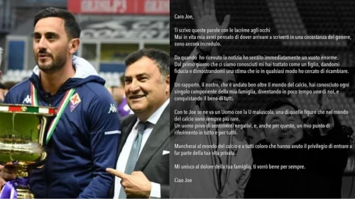 L’ex centrocampista Viola ed ex allenatore della Fiorentina Primavera, Alberto Aquilani, ha ricordato con una lettera Joe Barone. Ecco le sue parole pubblicate attraverso un post sul proprio profilo Instagram: “Caro Joe, Ti scrivo queste parole con le lacrime agli occhi. Mai in vita mia avrei pensato di dover arrivare a scriverti in una circostanza … Leggi tutto Aquilani scrive: “Ho le lacrime agli occhi, sento un vuoto enorme. Mi hai trattato come un figlio”