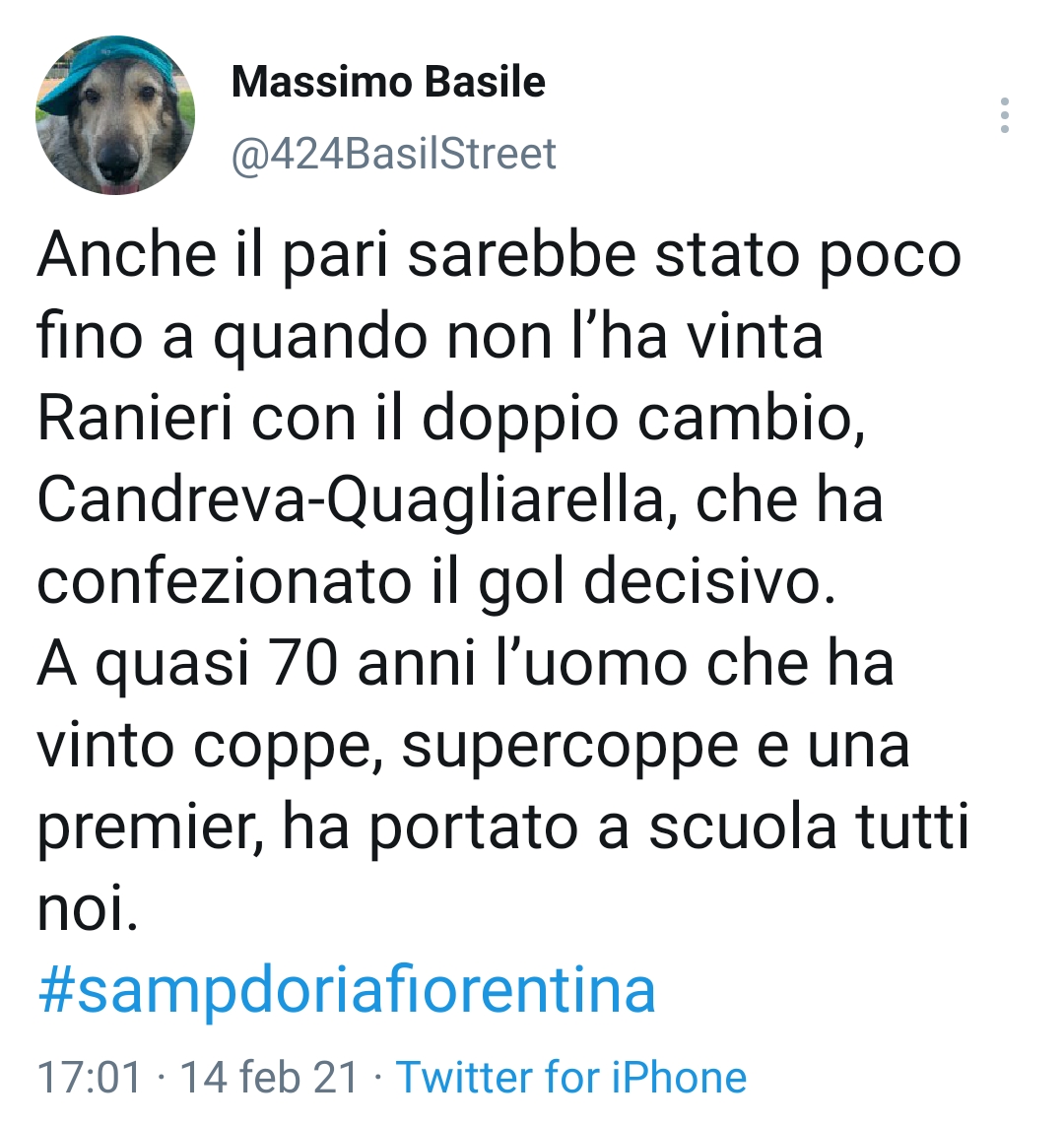 Questo il suo post: “Anche il pari sarebbe stato poco fino a quando non l’ha vinta Ranieri con il doppio cambio, Candreva-Quagliarella, che ha confezionato il gol decisivo. A quasi 70 anni l’uomo che ha vinto coppe, supercoppe e una premier, ha portato a scuola tutti noi”.