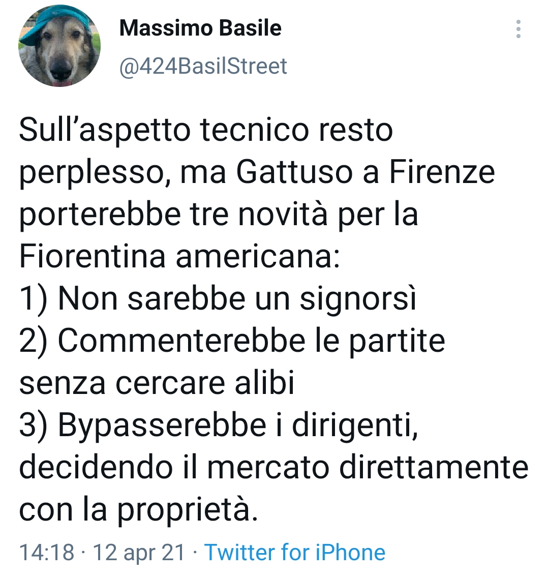 Questo il suo tweet sulla sua pagina ufficiale di Twitter: “Sull’aspetto tecnico resto perplesso, ma Gattuso a Firenze porterebbe tre novità per la Fiorentina americana: Non sarebbe un signorì, commenterebbe le partite senza cercare alibi e bypasserebbe i dirigenti, decidendo il mercato direttamente con la proprietà”.