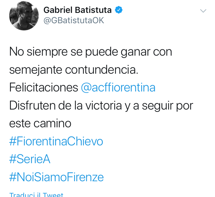 Questo il tweet celebrativo di Gabriel Omar Batistuta nel day after, Fiorentina-Chievo: “Non sarà sempre possibile vincere con una simile forza. Congratulazioni Fiorentina. Approfitta della vittoria per proseguire su questa strada”.