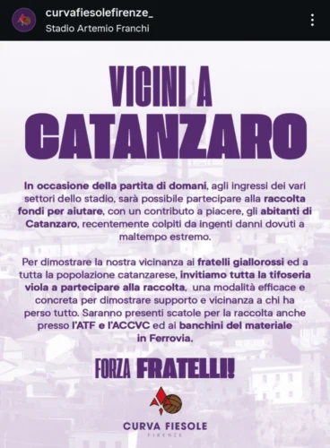 Con un comunicato sulla propria pagina Instagram, la Curva Fiesole ha annunciato un’iniziativa di raccolta fondi per aiutare gli abitanti di Catanzaro colpiti dal maltempo in occasione della partita tra Fiorentina e Cagliari di domani: “In occasione della partita di domani, agli ingressi dei vari settori dello stadio, sarà possibile partecipare alla raccolta fondi per aiutare, con un contributo a piacere, gli abitanti di Catanzaro, recentemente colpiti da ingenti danni dovuti a maltempo estremo. Per dimostrare la nostra vicinanza ai fratelli giallorossi ed a tutta la popolazione catanzarese, invitiamo tutta la tifoseria viola a partecipare alla raccolta, una modalità efficace e concreta per dimostrare supporto e vicinanza a chi ha perso tutto. Saranno presenti scatole per la raccolta anche presso l’ATF e l’ACCVC ed ai banchini del materiale in Ferrovia”.