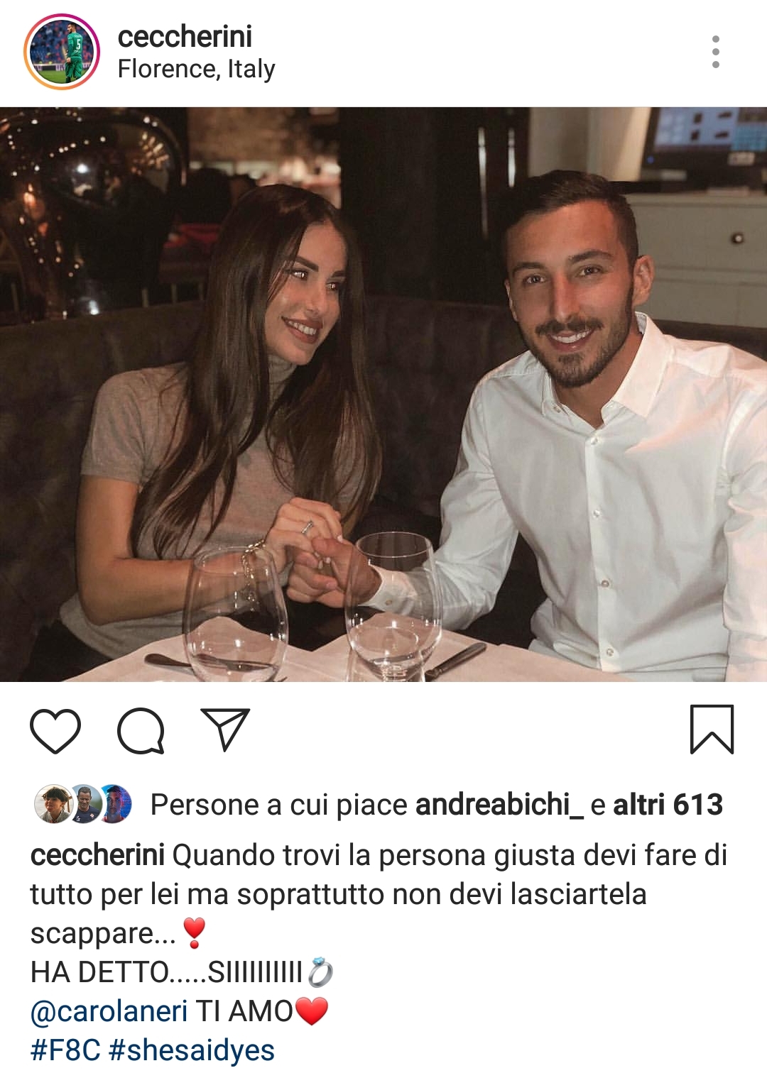 Tramite Instagram il difensore della Fiorentina Federico Ceccherini ha annunciato le future nozze con la fidanzata. Ecco il post del calciatore che ha reso tutto noto dopo una cena a Firenze