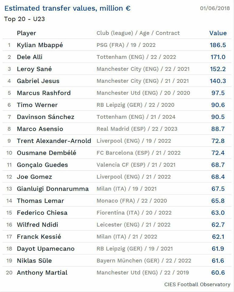 Nella top 100 mondiale Chiesa è 78′ con 63 milioni di valore. Il giocatore più costoso è Harry Kane con oltre 200 milioni di valore.
