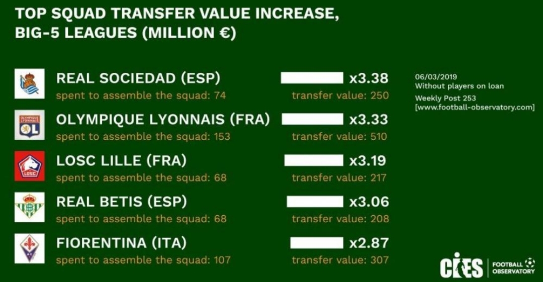 Secondo quanto riporta il CIES, osservatorio statistico sul calcio, ha stilato una classifica interessante prendendo in esame l’incremento di valore dei giocatori di ogni squadra. Il dato interessante è che la prima delle italiane risulta essere proprio la Fiorentina, che si assesta al quinto posto della classifica generale: 107 i milioni pagati per mettere su una rosa che ora ne vale però 307. Un aumento di 2,87 volte. Al comando di questa classifica gli spagnoli del Real Societad