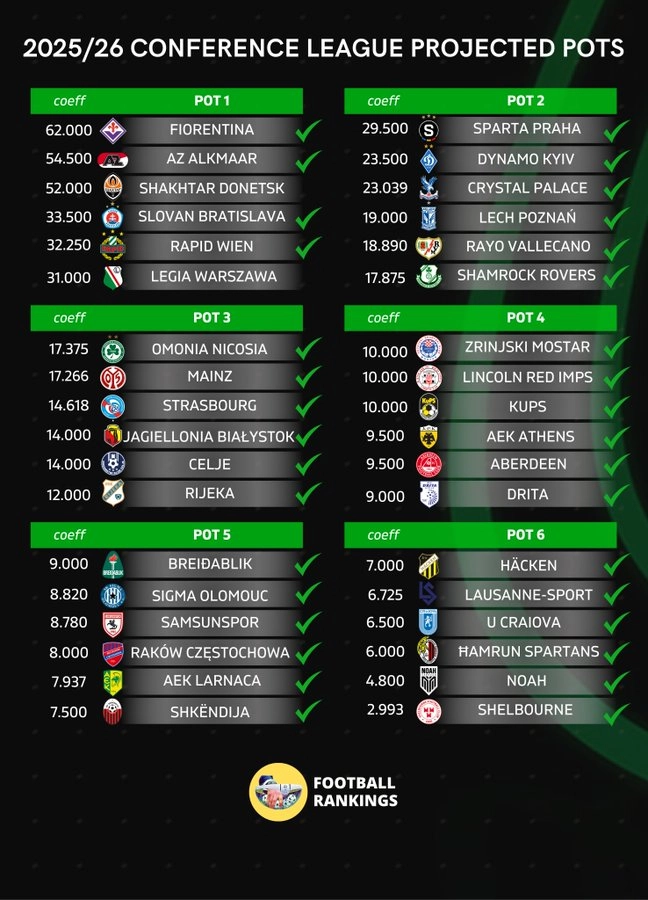 Domani ore 13 il sorteggio della fase a gironi. La Fiorentina sarà anche quest’anno testa di serie. Di seguito la proiezione ufficiosa dei gironi secondo il rispettivo coefficiente riportata da FootballRankings