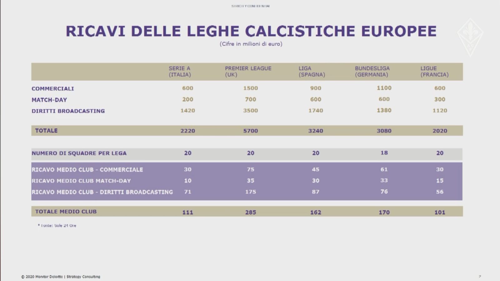 “Abbiamo Deloitte, una delle più grandi associazioni di consulenze nel mondo. Luigi Capitanio, direttore, vi spiegherà l’analisi che abbiamo fatto. L’Italia è quinta per ricavi, nei diritti siamo ultimi: 40 milioni a squadra, la Liga 45 e la Premier 110. Grande differenza. Le squadre che hanno fatto il loro stadio, come il Manchester City, che era grande quanto la Fiorentina, oggi è a 611 milioni di ricavi. La Juventus è passata da 200 milioni a 460. Avendo studiato analisi correlativa, so che i ricavi di una squadra sono collegati al successo sul campo”.