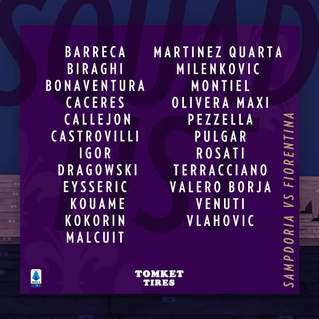 Questa la lista dei convocati da Prandelli per la partita di domani della Fiorentina contro la Sampdoria alle ore 15: “Dragowsli, Terracciano, Rosati; Caceres, Pezella, Milenkovic, Quarta, Igor, Biraghi, Venuti, Barrecca, Malcuit, Maxi Olivera; Pulgar, Castrovilli, Eysseric, Valero, Bonaventura, Montiel; Kokorin, Kouame e Vlahovic.