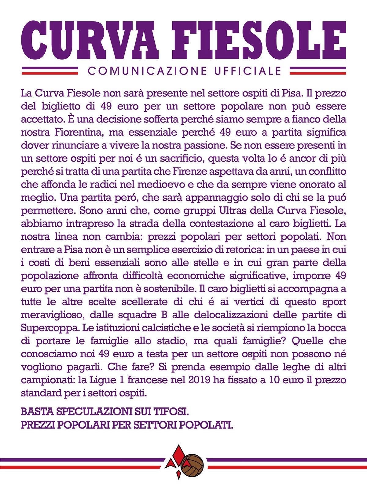 Curva Fiesole: “Assenti a Pisa perchè il costo di 49 euro per un biglietto non può essere accettato”