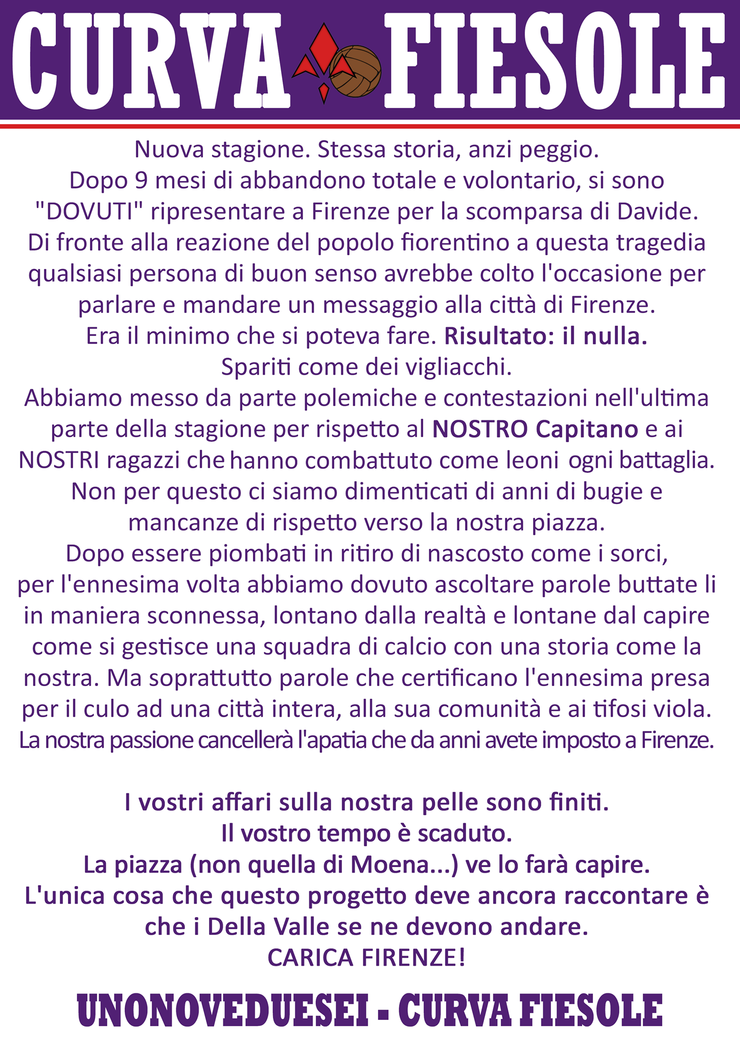 UNONOVEDUESEI – CURVA FIESOLE ha diffuso un comunicato nel quale vengono esposte le posizioni su quanto avvenuto negli ultimi nove mesi. Tanti i temi toccati: dalla tragica scomparsa del capitano Davide Astori, fino all’atteggiamento della proprietà e di parte della tifoseria. Proponiamo, di seguito, il comunicato diffuso pochi minuti fa.
