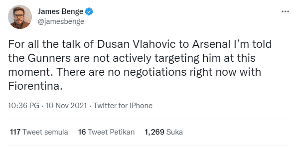 Arrivano importanti smentite sul pressing che l’Arsenal starebbe portando avanti per Vlahovic. Secondo quanto riferito da James Benge su Twitter, corrispondente per il canale sportivo statunitense CBS Sports, i Gunners, al momento, non stanno trattando con i viola per la punta serba.