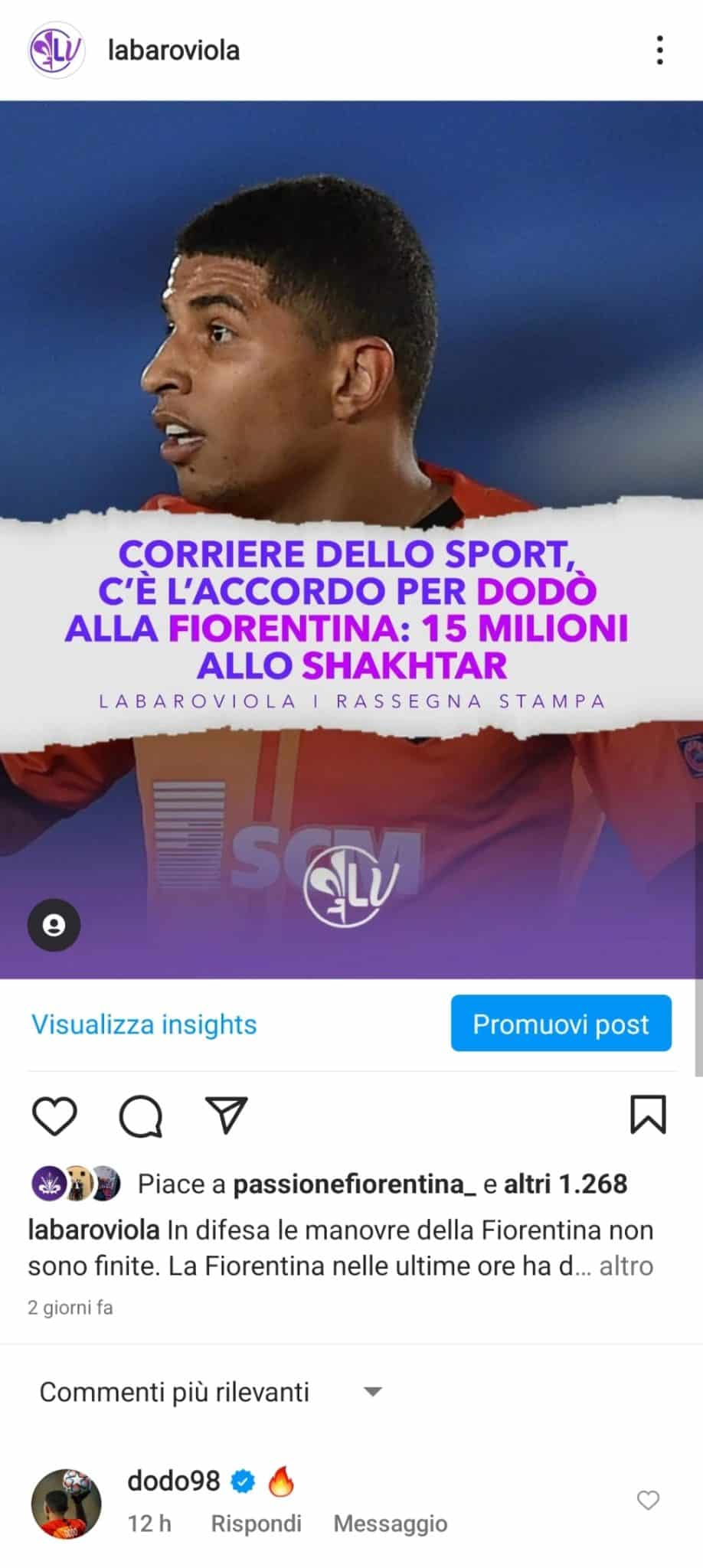 Dodo scrive a Labaro Viola su Instagram, gioia dopo la notizia dell’accordo tra Fiorentina e Shakhtar