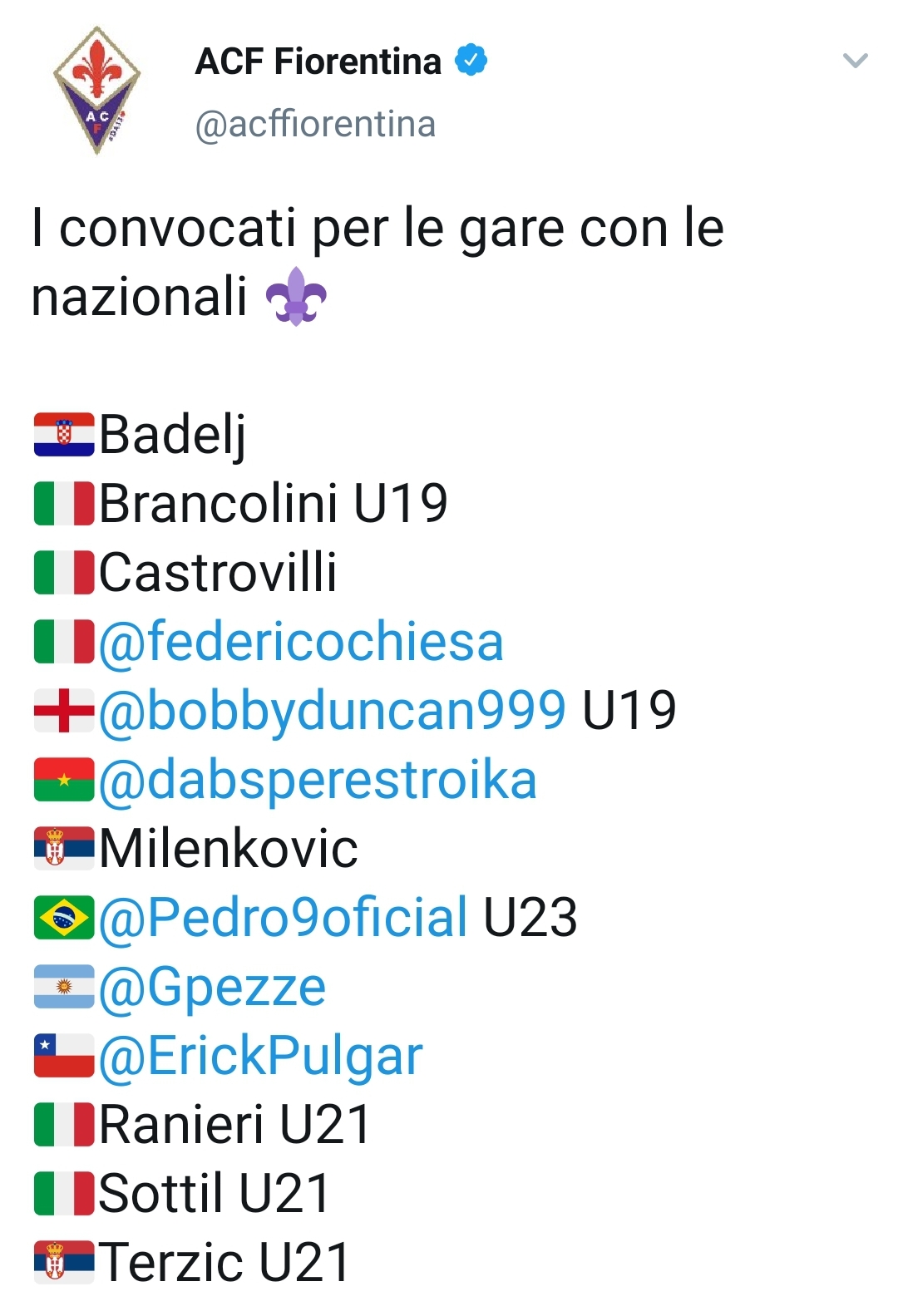 Attraverso il suo canale Twitter la Fiorentina ha comunicato tutti i tesserati della prima squadra che saranno convocati in nazionale. Ecco la lista viola
