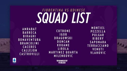 Questa la lista dei giocatori convocati da Iachini nella sfida di domani alle ore 18 con l’Udinese di mister Gotti: Dragowski, Terracciano, Brancolini; Barreca, Lirola, Caceres, Pezzella, Milenkovic, Quarta, Igor, Biraghi, Venuti; Saponara, Montiel, Amrabat, Pulgar, Castrovilli, Duncan, Bonaventura; Ribery, Vlahovic, Kouame, Cutrone. SarĂ presente anche Frack Ribery in dubbio fino all’ultimo a causa di … Leggi tutto Ecco la lista dei convocati da Iachini con l’Udinese. Presente anche Ribery