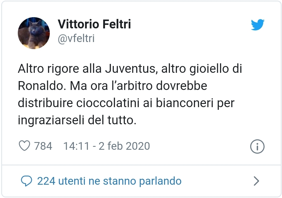 Non si è fatta attendere la reazione di Vittorio Feltri, direttore di Libero. Il noto simpatizzante viola, ha ironizzato sull’arbitraggio di Juventus-Fiorentina, sollevando grossi dubbi su entrambi i rigori concessi alla Juve.