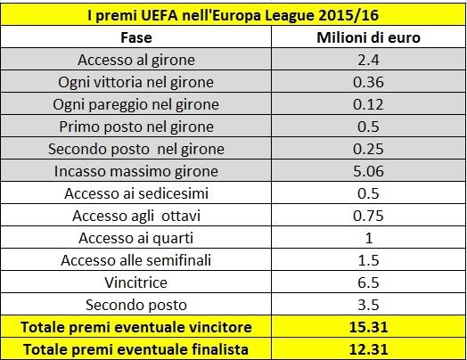 Vediamo qui nel dettaglio i soldi che dà solo la Uefa nel cammino europeo. Attenzione, questi sono solo i soldi che vengono dati dalla Uefa, a questi bisogna aggiungerci i partner economici e commerciali (sponsor) e i soldi in arrivo dalle televisioni.