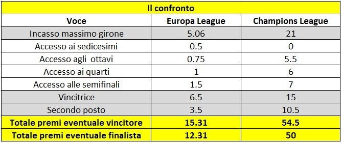 Questa invece la differenza di “premi” tra Champions ed Europa League. La differenza c’è ed è tanta. Ma come già detto a questi ci dobbiamo aggiungere i soldi delle televisioni e delle sponsorizzazioni. Soldi che poi sanciscono l’abisso di differenza tra Champions ed Europa League.
