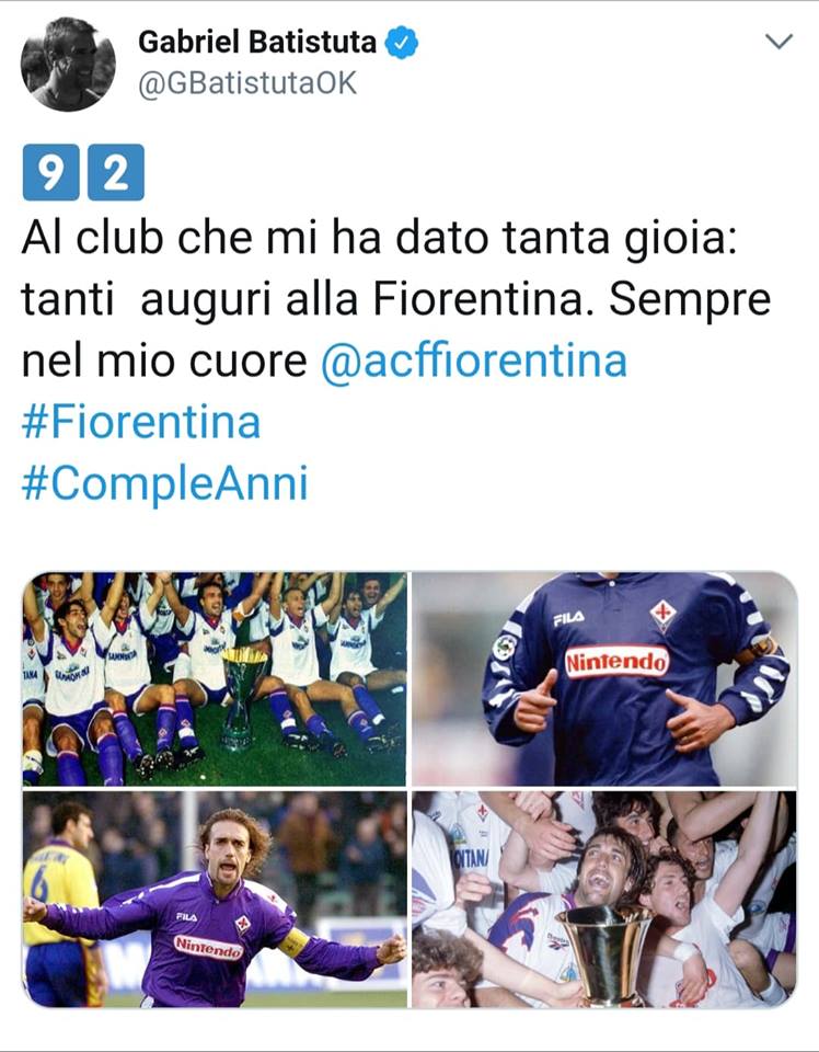 Tra i tanti auguri che sono arrivati alla Fiorentina per il suo novantaduesimo compleanno, non sono mancati inevitabilmente quelli di Gabriel Omar Batistuta.