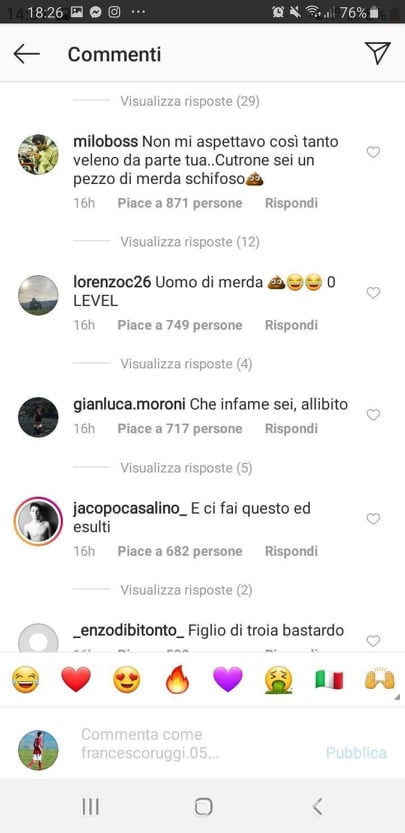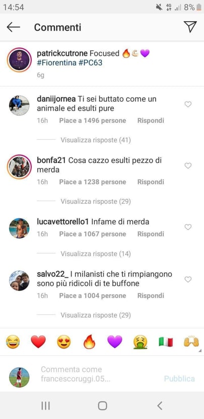 Questi alcuni degli insulti che l’attuale attaccante viola ha ricevuto sotto una foto sul suo profilo social di Instagram: