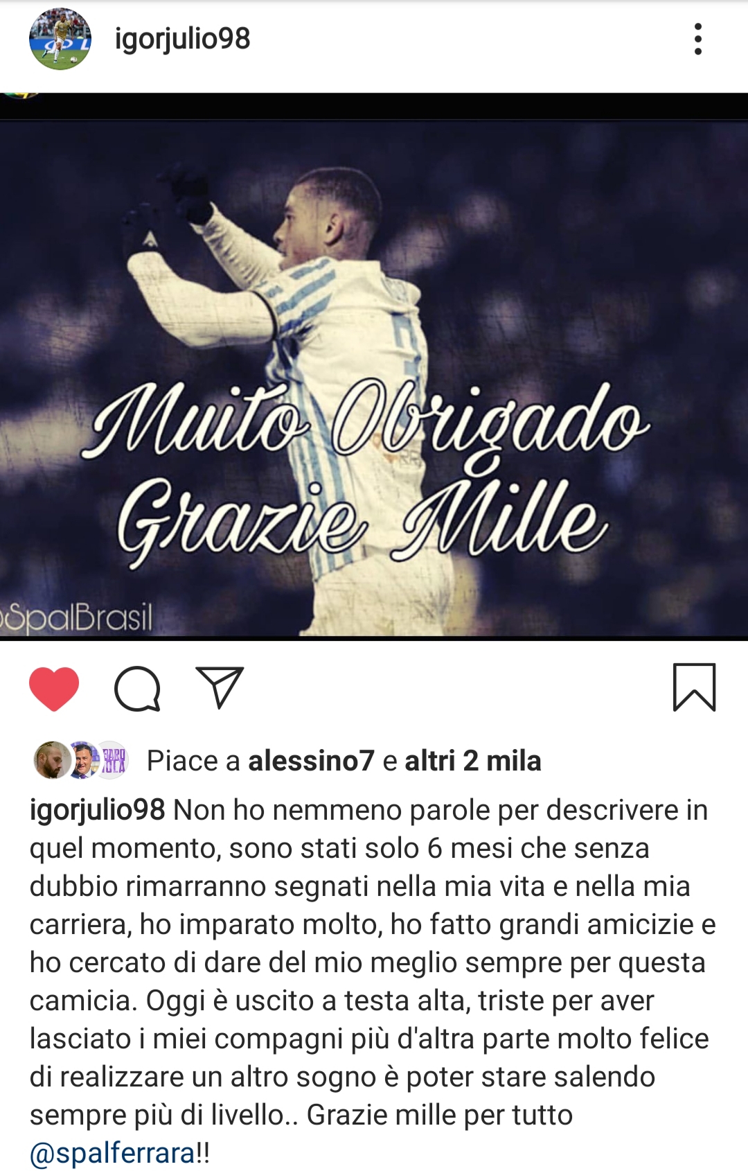 Di seguito riportiamo la foto relativa al post di ringraziamento del calciatore Igor. Il brasiliano ha voluto così salutare la SPAL ed i suoi tifosi per questi sei mesi. “È ora di salire di livello”.