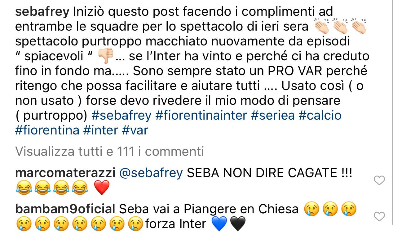 Tra i commenti al post di Frey ecco quelli di Marco Materazzi e Ivan Zamorano. Il primo ha risposto così: “Seba non dire cag…”. Il secondo invece: “Vai a piangere in chiesa, forza Inter”. Un botta e risposta che ha animato il Fiorentina-Inter del web. Lo riporta il Corriere dello Sport