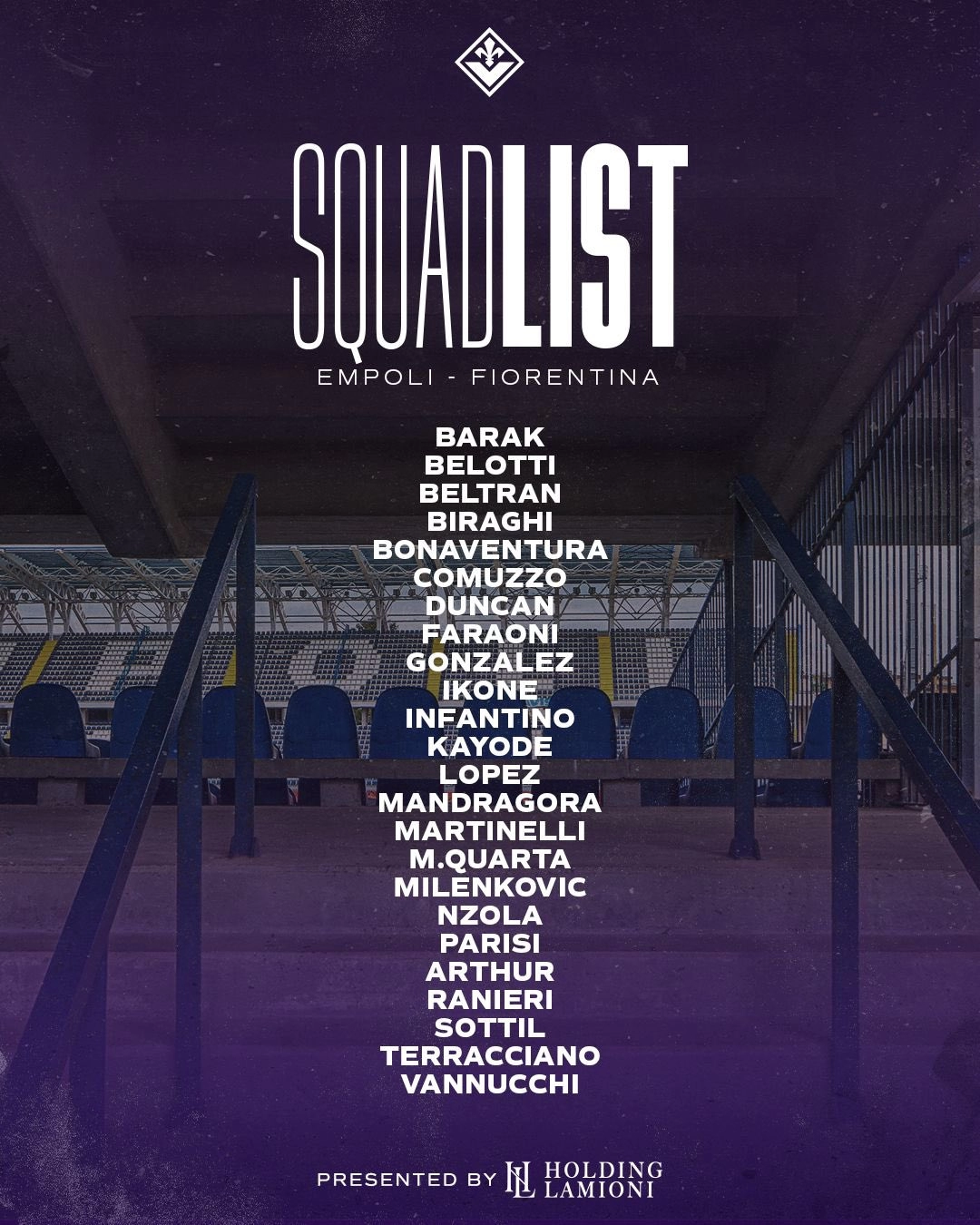 Questa la lista dei convocati di Vincenzo Italiano per la sfida contro l’Empoli in programma domani alle ore 15 allo stadio Castellani. Manca il portiere Christensen che si è operato settimana scorsa e tornerà fra 7 giorni. Ancora fuori i lungo degenti Dodò e Castrovilli. Per la squadra viola ritiro al Viola Park prima della partenza prevista domani mattina verso Empoli. Questa la lista dei convocati