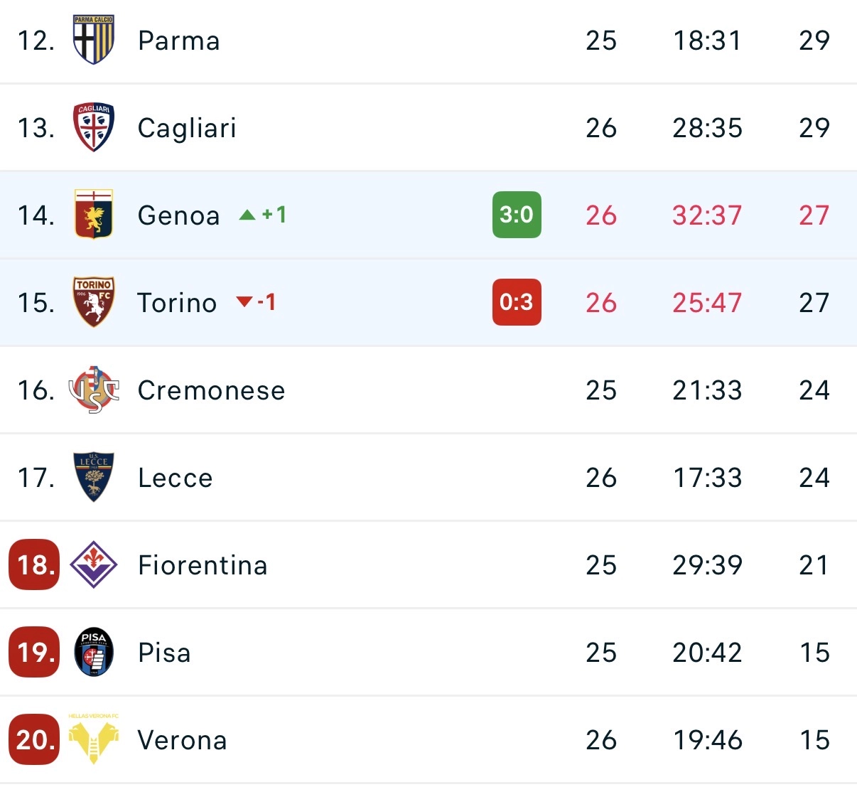 Il Genoa vince contro il Torino e si porta a 27 punt. La Fiorentina a 21 punti con una partita in meno. Il racconto della gara