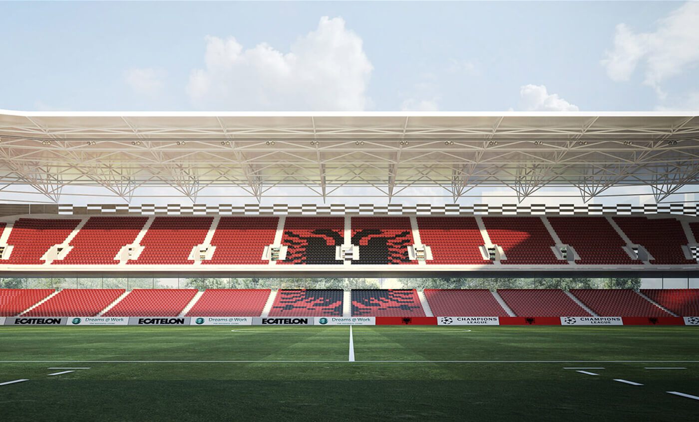 Ci sono integrati tutti i servizi e 300 posti auto, più un tunnel che rende completamente pedonale l’area dello stadio senza impattare sul traffico. La struttura ospita uffici e attività commerciali. I materiali sono in gran parte italiani, i disegni degli elementi di acciaio sono stati sviluppati nel nostro Paese e realizzati nelle fonderie albanesi, la tecnologia led arriva dagli States e i sedili dall’Australia. Un bel melting pot.