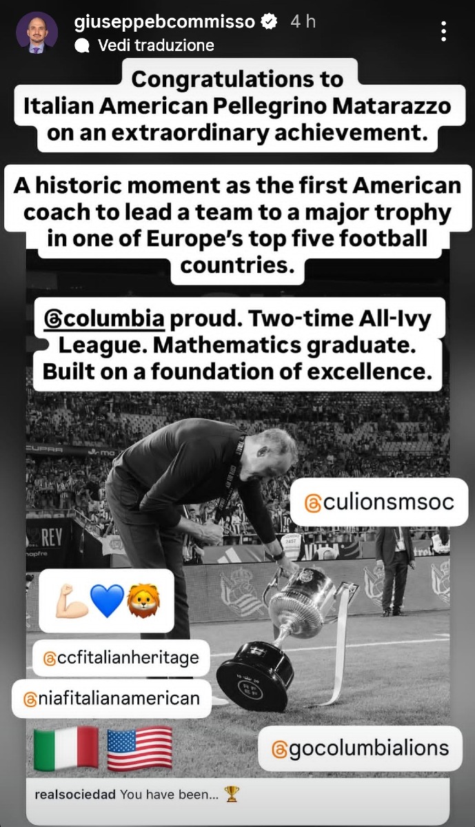 “Congratulazioni all’italo-americano Pellegrino Matarazzo per uno straordinario traguardo. Un momento storico: è il primo allenatore americano a guidare una squadra alla vittoria di un trofeo importante in uno dei cinque principali campionati europei. Columbia University è orgogliosa. Due volte All-Ivy League. Laureato in matematica. Un percorso costruito su basi di eccellenza”.