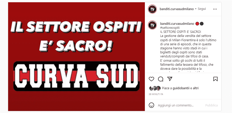 Con un post su Instagram, la Curva Sud Milano ha detto la sua in merito al caos dei biglietti del settore ospiti per Milan-Fiorentina di domenica: “La gestione della vendita del settore ospiti per Milan-Fiorentina è solo l’ultima di una serie di episodi che in questa stagione hanno visto stadi in cui i biglietti degli ospiti sono stati venduti/comprati dai tifosi di casa. E’ ormai sotto gli occhi di tutti il fallimento della tessera dei tifosi che doveva dare la possibilità e la precedenza di acquisto ai tifosi sempre presenti, e che invece crea soltato disagi nell’acquisto con tessere non censite e sistemi di vendita che non si interfacciano tra loto, impendendo di fatto l’acquisto a molti tifosi. Chiediamo quindi all’AC Milan, da sempre attenta e sensibile alle legittime esigenze dei tifosi, di farsi portavoce di tutte le società per le trasferte, portando la questione sul tavolo dell’osservatorio (seguendo l’esempio delle gare europee dove i biglietti della trasferta vengono gestiti direttamente dalla società ospitata), e allo stesso tempo di trovare una soluzione immediata per porre rimedio a questa spiacevole situazione in vista di domenica, perchè ci teniamo a dirlo chiaramente e fermamente: per NOI il settore ospiti è sacro ed è fondamentale in ogni stadio. Per noi è impensabile non avere a disposizione un settore dal quale sostenere il nostro Milan in trasferta. Uno stadio senza il settore ospiti, senza la tifoseria rivale o senza noi come tifoseria ospitata, è la cosa più lontana e inconcepibile dalla nostra idea di stadio e di calcio, per il nostro essere la Curva Sud Milano. Lo riporta milanews