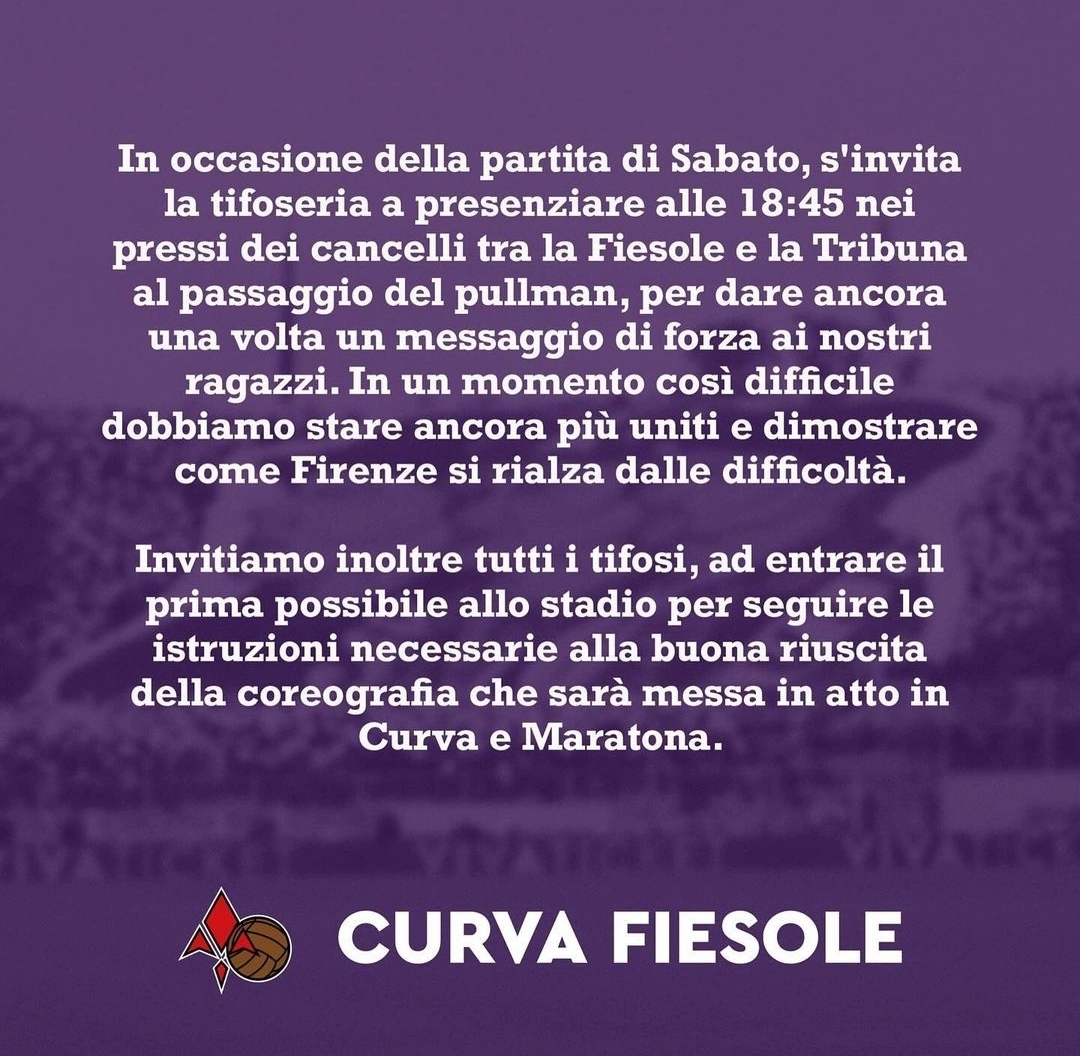 La Curva Fiesole ha annunciato le iniziative in programma per Fiorentina-Milan, questo il comunicato dei tifosi viola che annunciano una grande Coreografia.