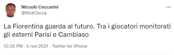 Diverse fonti parlano di emissari della Fiorentina a seguire ieri Empoli-Genoa. Uno degli osservati era sicuramente Szymon Zurwkoski in prestito dalla Fiorentina all’Empoli, che per altro è andato in gol. Tuttavia, l’esperto di calciomercato Niccolo Ceccarini ha rivelato altre informazioni sulla presenza viola a Empoli: “La Fiorentina guarda al futuro. Tra i giocatori monitorati gli esterni Parisi e Cambiaso”. Pare dunque evidente la visita dei viola ieri sera al Castellani