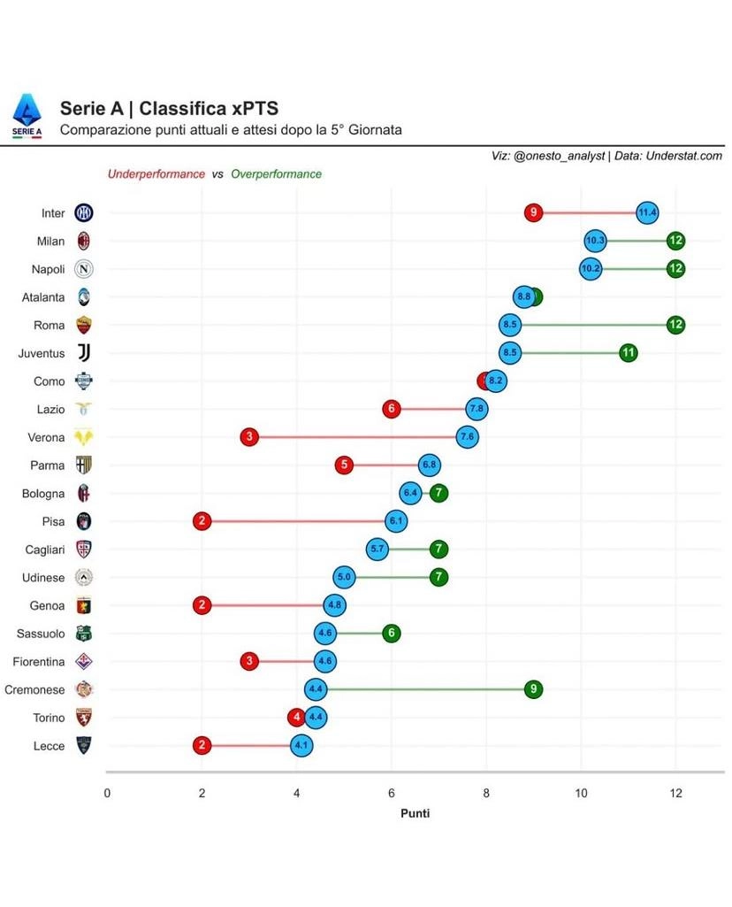 La classifica dei punti attesi (Xpts) dopo cinque giornate di campionato vede la Fiorentina al quart’ultimo posto con solo 1,6 punti in più rispetto ai 3 punti reali fatti in Serie A.  In questa classifica il Pisa, che ha soli due punti in classifica, passerebbe la Fiorentina raggiungendo i 6 punti in graduatoria. Tra le big la piú penalizzata sarebbe l’Inter che in questa speciale classifica sarebbe la prima in classifica.