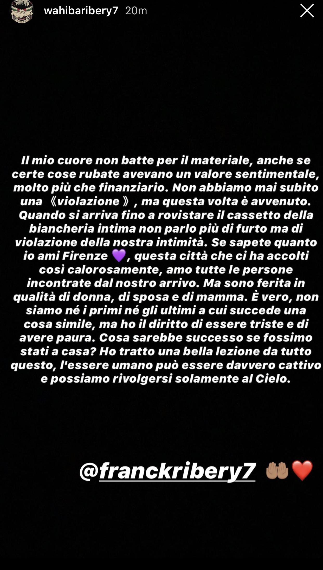 La moglie di Ribery: “Amo Firenze ma mi sento ferita ed ho paura. Mai subito un furto prima d’ora”
