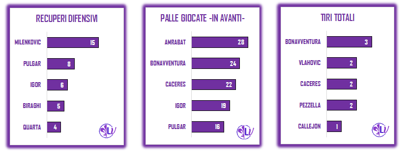 Le statistiche individuali evidenziano come in fase difensiva Milenkovic abbia recuperato il maggior numero di possessi: 15, a seguire Pulgar con 8, poi Igor con 6 e Biraghi con 5.