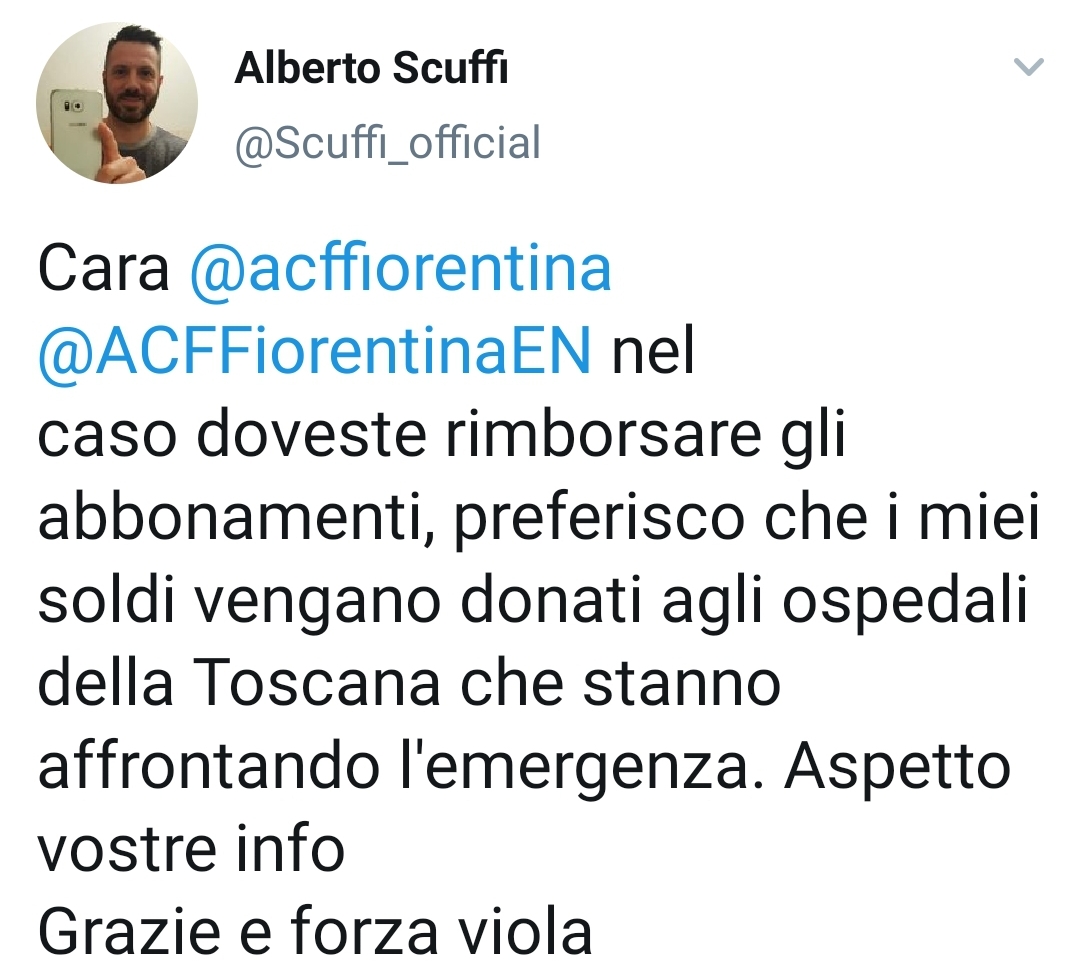 Direttamente da Twitter arriva la proposta di un tifoso viola che chiede alla Fiorentina, se ci fosse la possibilità di un rimborso degli abbonamenti dopo le vicende del Coronavirus, di non restituire i soldi ai tifosi viola ma darli all’ospedale di Firenze e di tutta la Toscana che curano i malati del Coronavirus. Ecco il tweet del tifoso viola