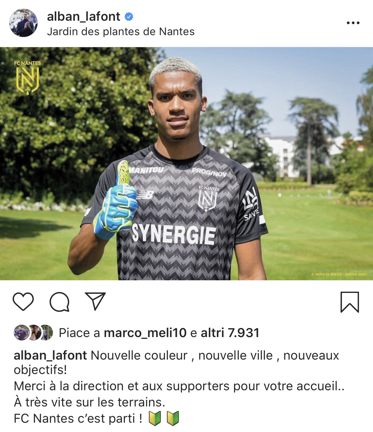 Alban Lafont, ormai ex portiere della Fiorentina in prestito al Nantes ha voluto salutare attraverso un post su Instagram i suoi nuovi tifosi. Queste le sue parole: “Nuovi colori, nuova città, nuovi obiettivi! Grazie ai dirigenti ed ai tifosi per la vostra accoglienza… a presto sui terreni da gioco. FC Nantes andiamo!”