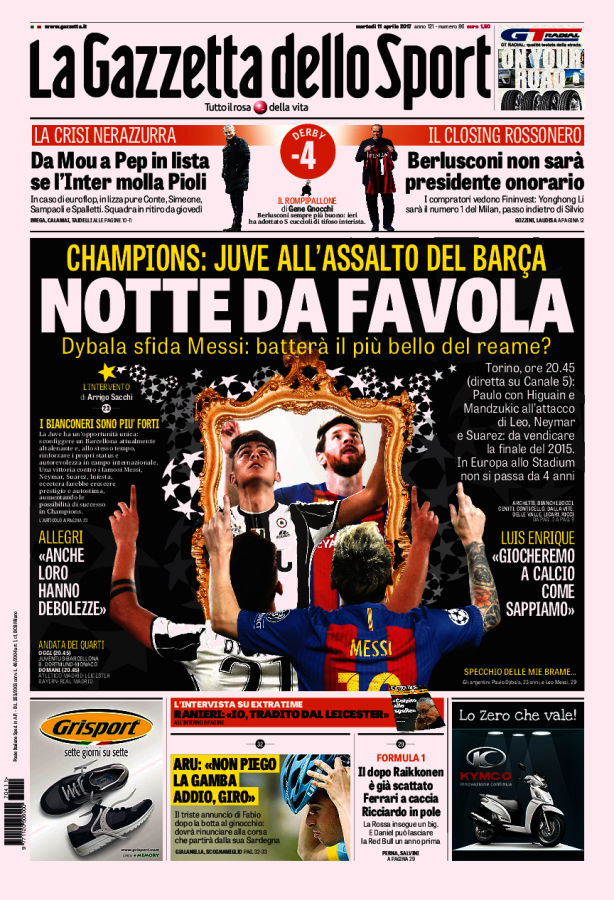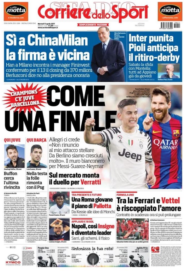 [caption id="attachment_17112" align="alignnone" width="640"] TuttoSport 11 Aprile 2017[/caption] [caption id="attachment_17113" align="alignnone" width="640"] Corriere Dello Sport 11 Aprile 2017[/caption] [caption id="attachment_17114" align="alignnone" width="614"] Gazzetta Dello Sport 11 Aprile 2017[/caption]