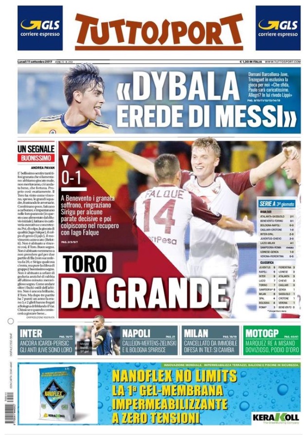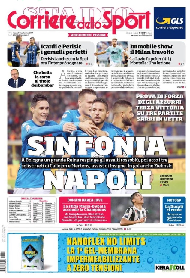 [caption id="attachment_28646" align="alignnone" width="614"] La Gazzetta Dello Sport 11 Settembre 2017[/caption] [caption id="attachment_28647" align="alignnone" width="633"] Corriere Dello Sport 11 Settembre 2017[/caption] [caption id="attachment_28648" align="alignnone" width="629"] TuttoSport 11 Settembre 2017[/caption] [caption id="attachment_25119" align="alignnone" width="300"] Sponsor Autoè[/caption]