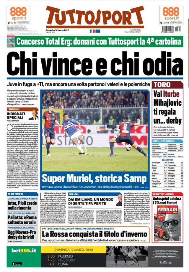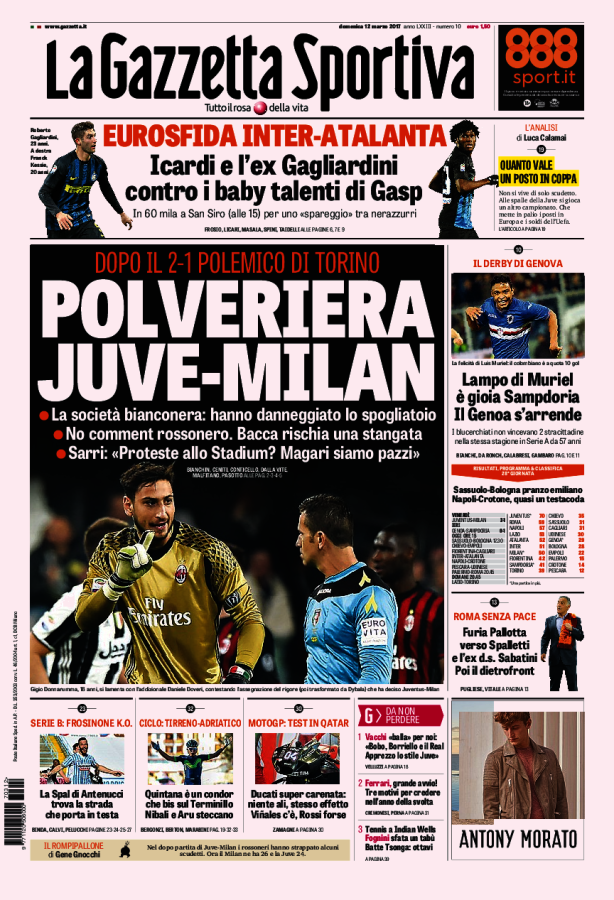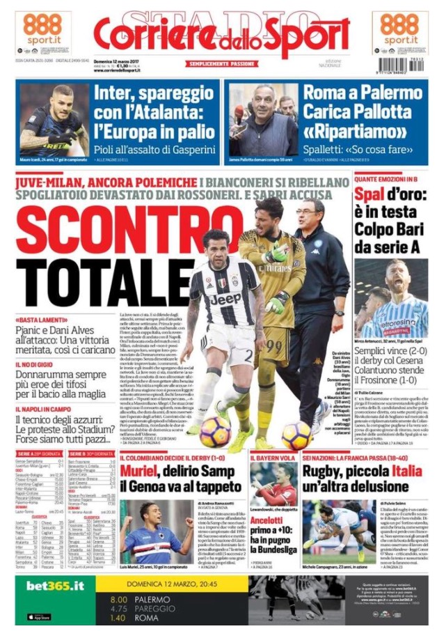 [caption id="attachment_15432" align="alignnone" width="614"] La Gazzetta Dello Sport 12 Marzo 2017[/caption] [caption id="attachment_15431" align="alignnone" width="628"] Corriere Dello Sport 12 Marzo 2017[/caption] [caption id="attachment_15430" align="alignnone" width="640"] TuttoSport 12 Marzo 2017[/caption]