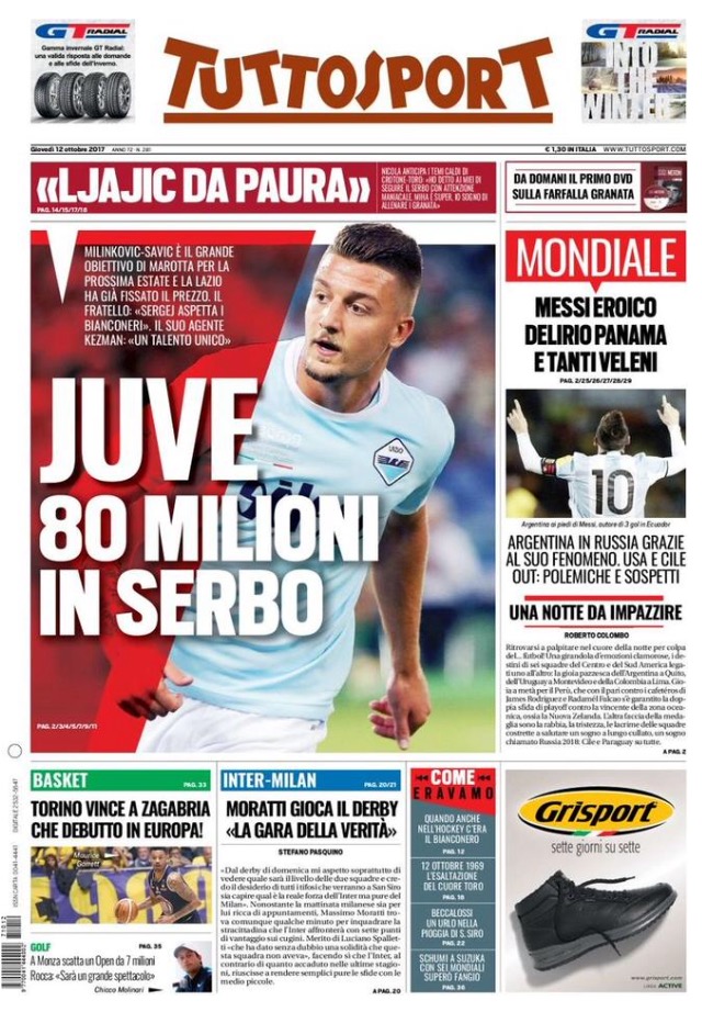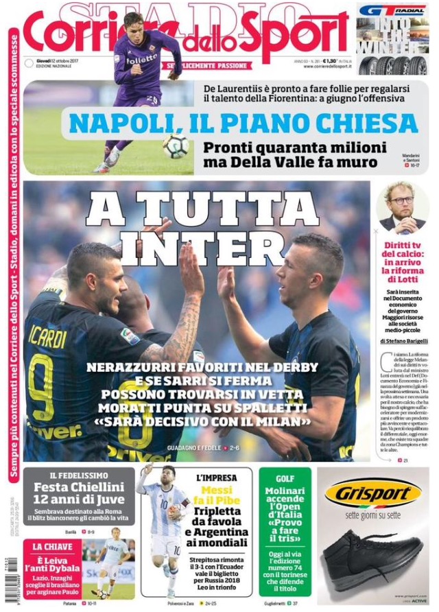 [caption id="attachment_30921" align="alignnone" width="614"] La Gazzetta Dello Sport 12 Ottobre 2017[/caption] [caption id="attachment_30922" align="alignnone" width="640"] Corriere Dello Sport 12 Ottobre 2017[/caption] [caption id="attachment_30923" align="alignnone" width="640"] TuttoSport 12 Ottobre 2017[/caption]