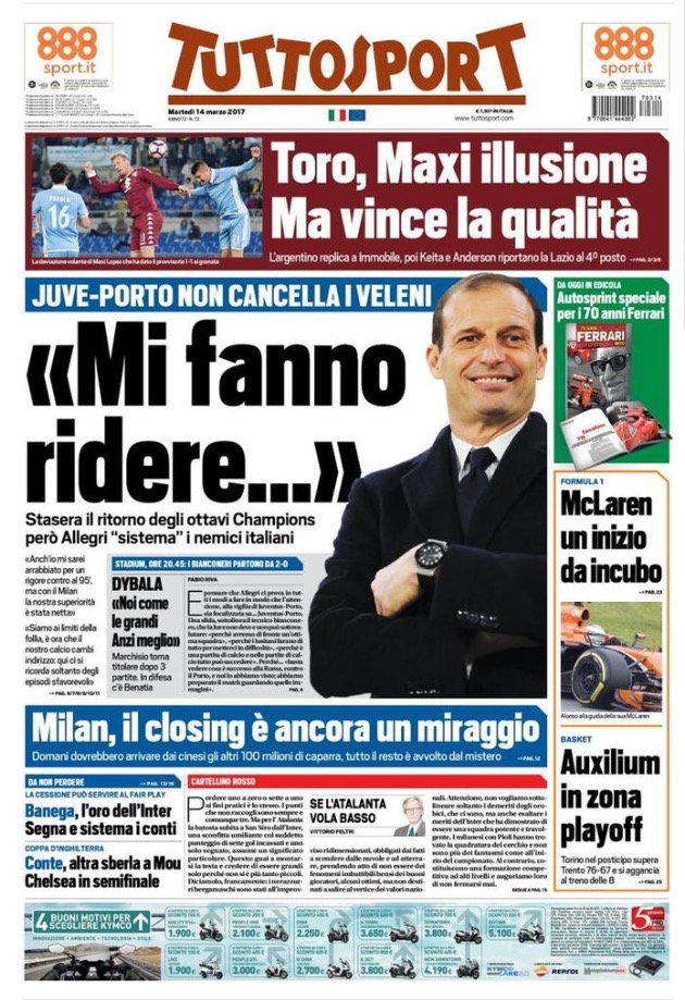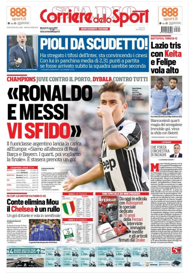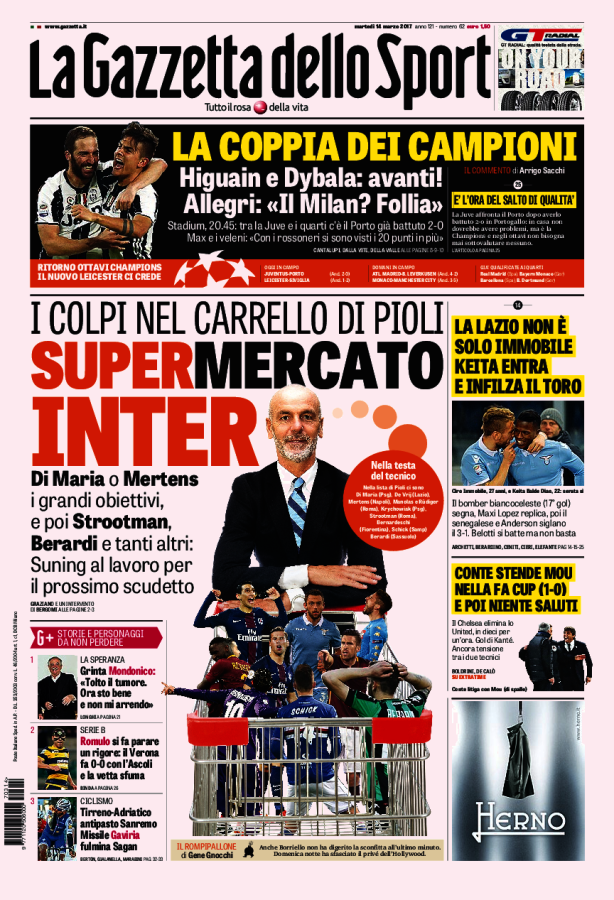 [caption id="attachment_15558" align="alignnone" width="614"] Gazzetta Dello Sport 14 Marzo 2017[/caption] [caption id="attachment_15559" align="alignnone" width="638"] Corriere Dello Sport 14 Marzo 2017[/caption] [caption id="attachment_15560" align="alignnone" width="630"] TuttoSport 14 Marzo 2017[/caption]