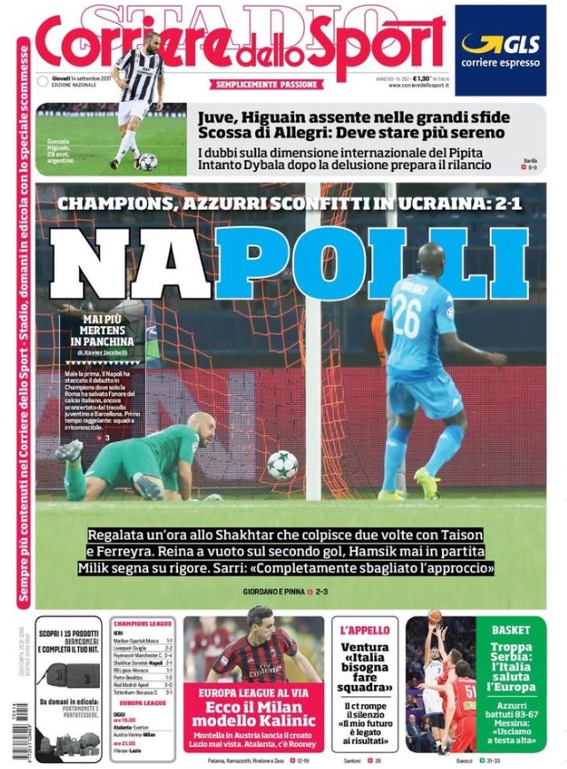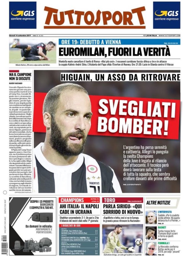 Le prime pagine dei principali quotidiani sportivi – 14 Settembre 2017