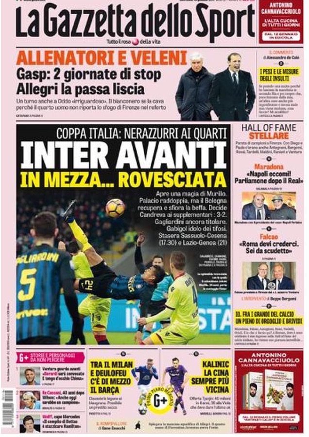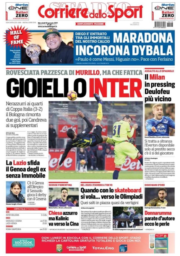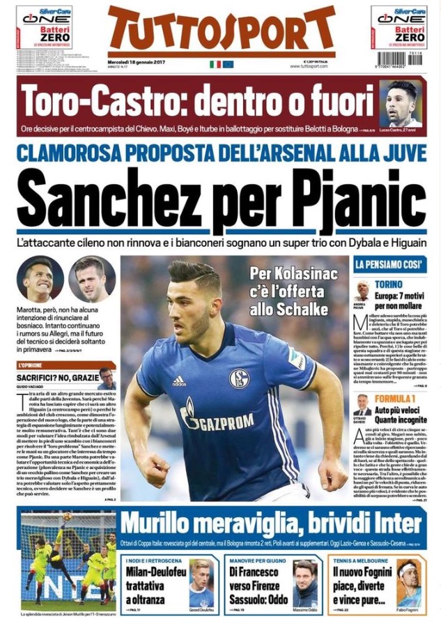 [caption id="attachment_12686" align="alignnone" width="609"] Corriere Dello Sport 18 Gennaio 2017[/caption] [caption id="attachment_12685" align="alignnone" width="636"] Gazzetta Dello Sport 18 Gennaio 2017[/caption] [caption id="attachment_12684" align="alignnone" width="633"] TuttoSport 18 Gennaio 2017[/caption]