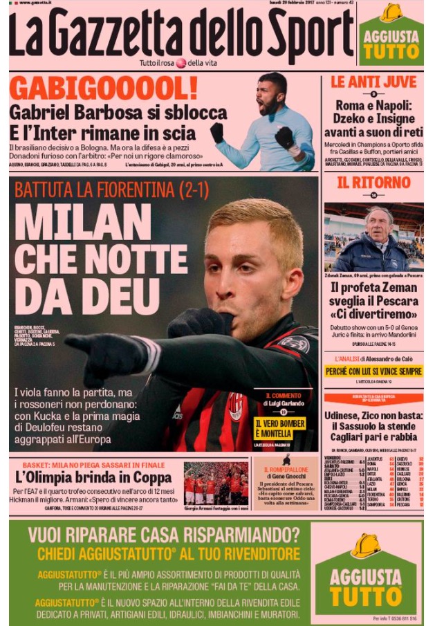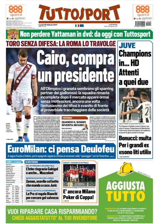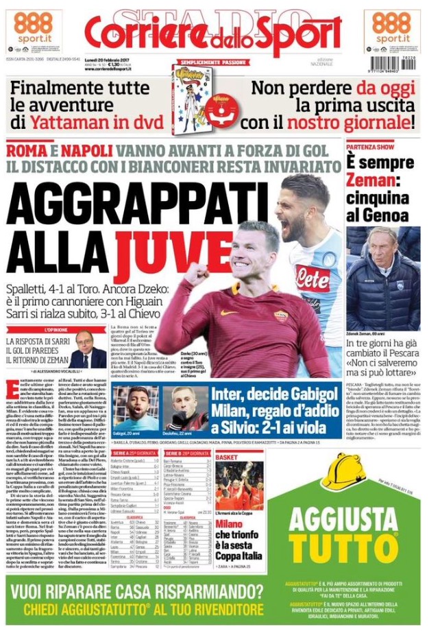 Le prime pagine dei principali quotidiani sportivi – 20 Febbraio 2017