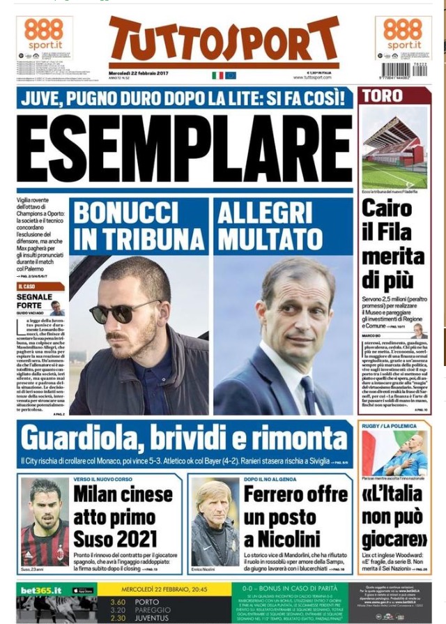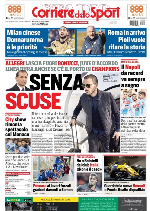 [caption id="attachment_14724" align="alignnone" width="640"] Gazzetta Dello Sport 22 Febbraio 2017[/caption] [caption id="attachment_14723" align="alignnone" width="628"] Corriere Dello Sport 22 Febbraio 2017[/caption] [caption id="attachment_14722" align="alignnone" width="640"] TuttoSport 22 Febbraio 2017[/caption]