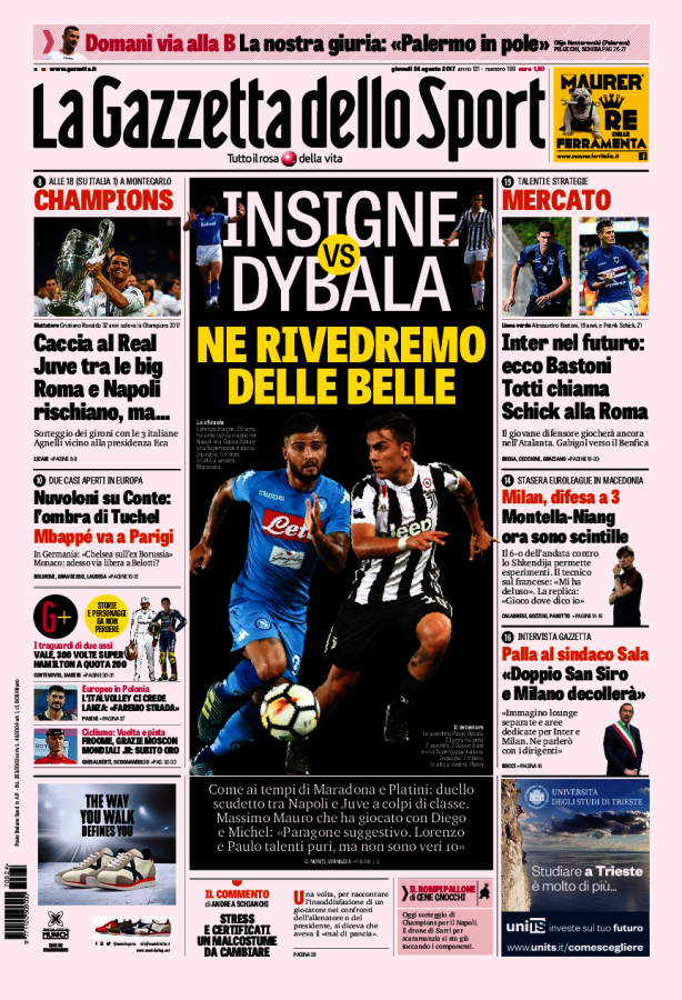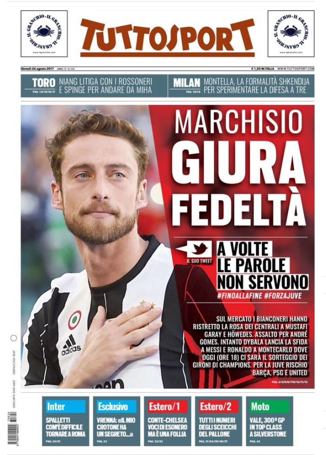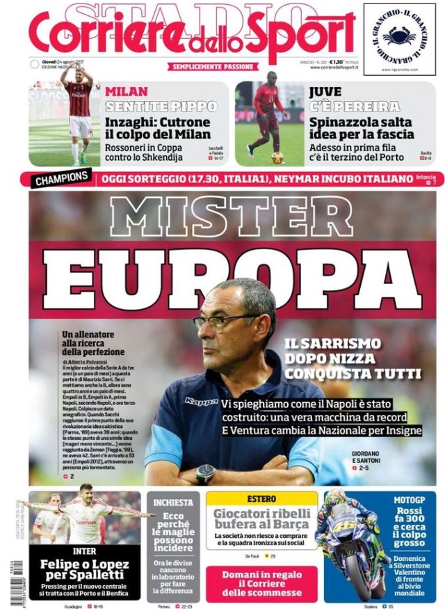 Le prime pagine dei principali quotidiani sportivi – 24 Agosto 2017