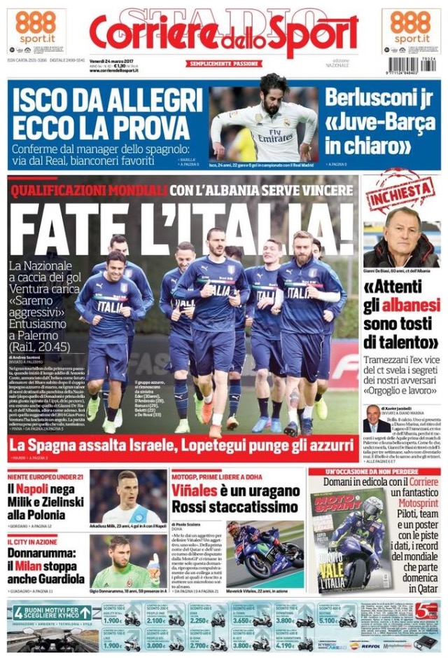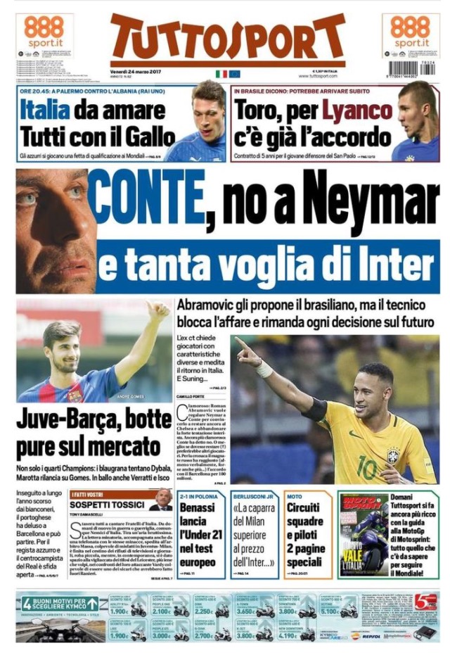 Le prime pagine dei principali quotidiani sportivi – 24 Marzo 2017