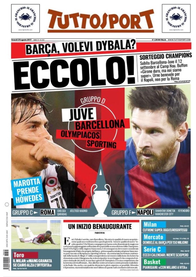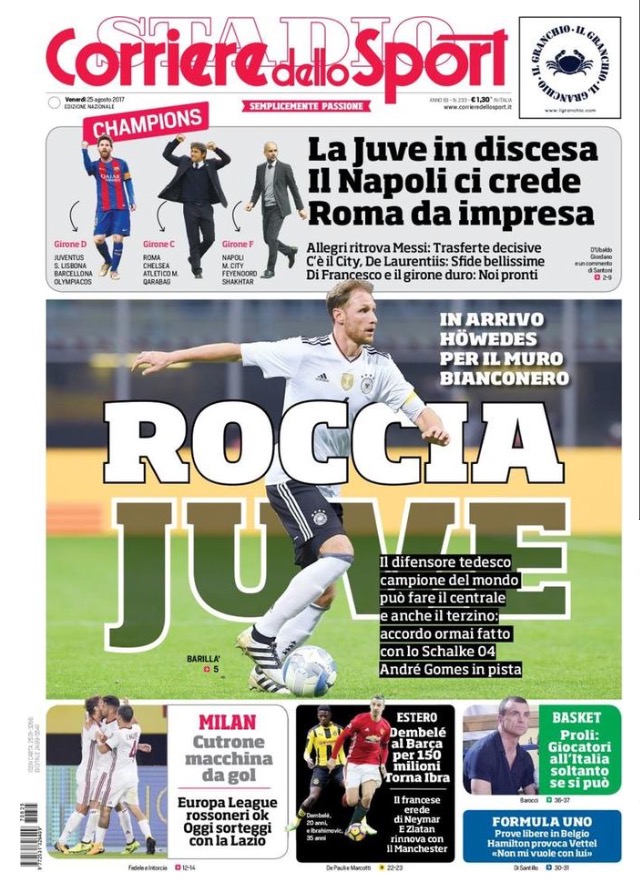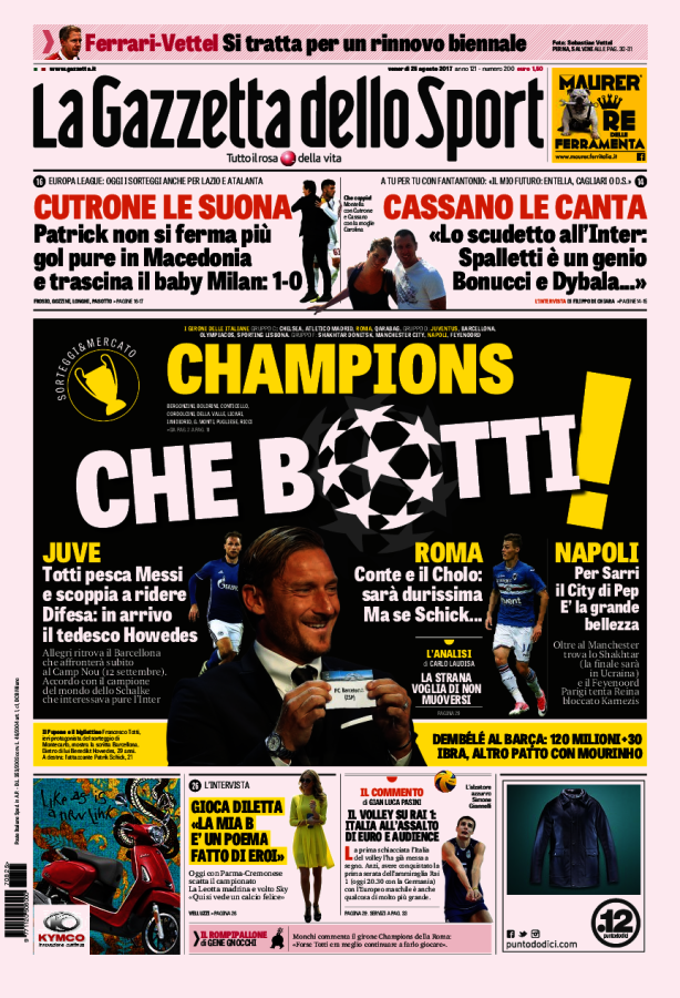 [caption id="attachment_27237" align="alignnone" width="638"] TuttoSport 25 Agosto 2017[/caption] [caption id="attachment_27238" align="alignnone" width="640"] Corriere Dello Sport 25 Agosto 2017[/caption] [caption id="attachment_27239" align="alignnone" width="614"] La Gazzetta Dello Sport 25 Agosto 2017[/caption] [caption id="attachment_25119" align="alignnone" width="300"] Sponsor Autoè[/caption]