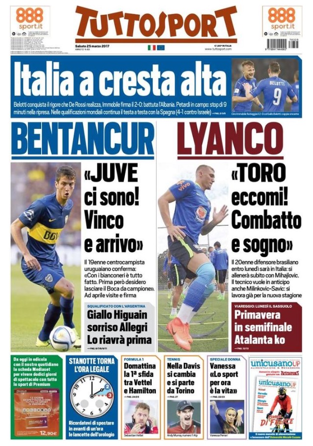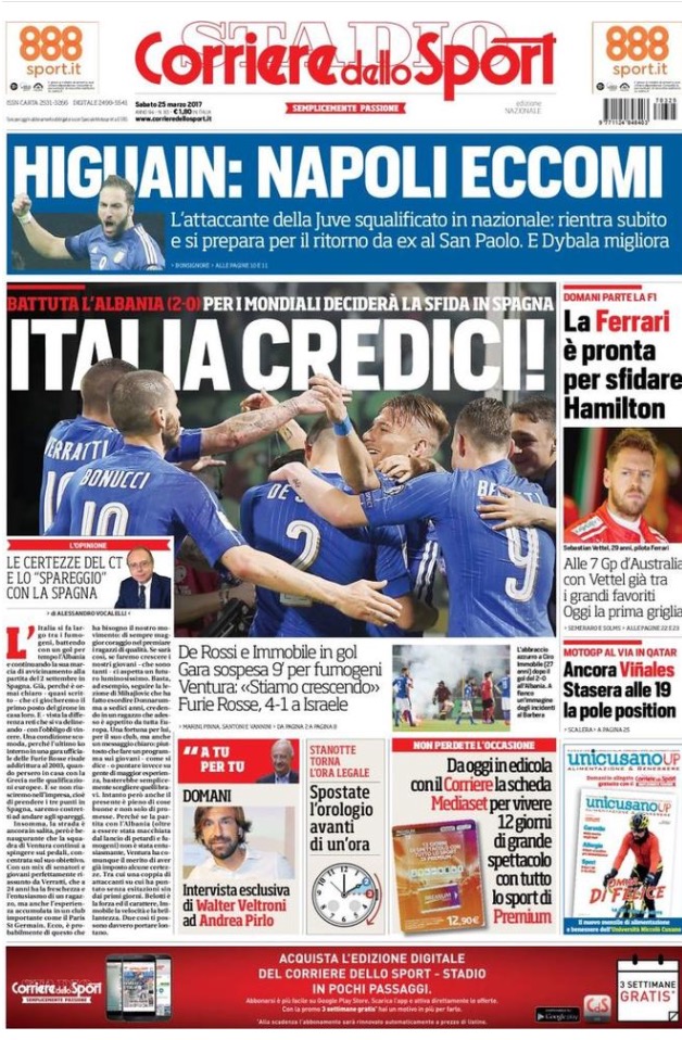 [caption id="attachment_16120" align="alignnone" width="639"] TuttoSport 25 Marzo 2017[/caption] [caption id="attachment_16121" align="alignnone" width="628"] Corriere Dello Sport 25 Marzo 2017[/caption]
